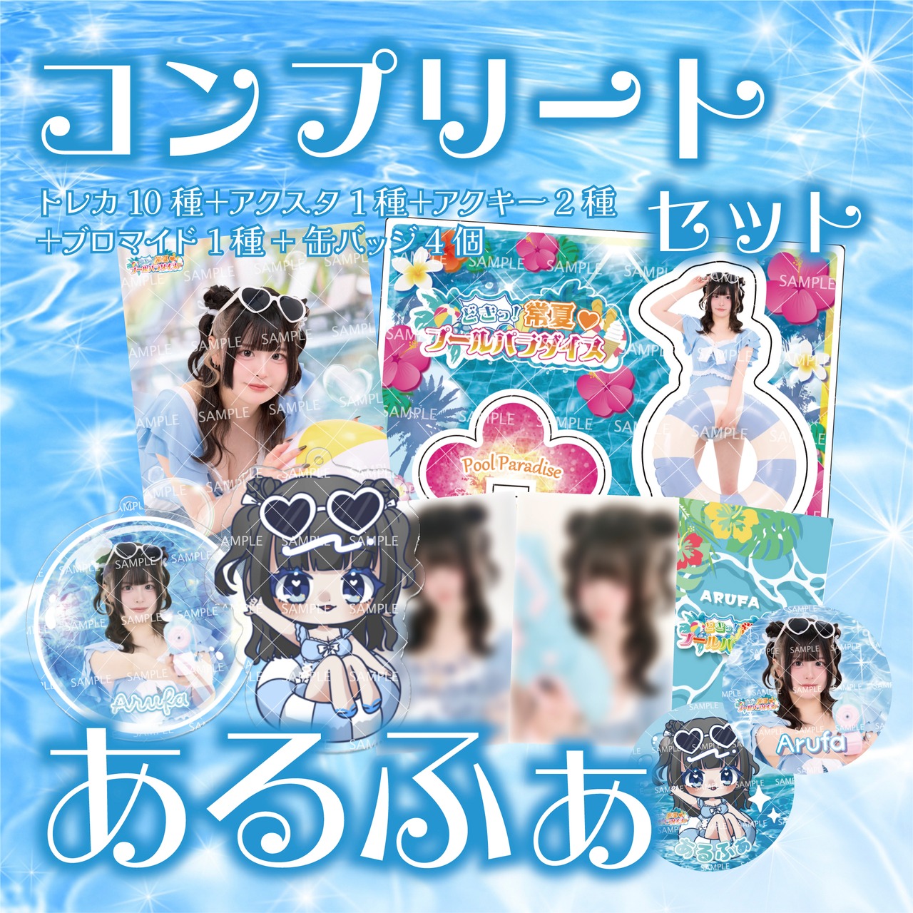 「どきっ!常夏♡プールパラダイス」のブロマイド1種・アクリルスタンド1個・イラストアクリルキーホルダー1個・実写アクリルキーホルダー1個・トレカ全10種・缶バッジ2種のセット商品です。