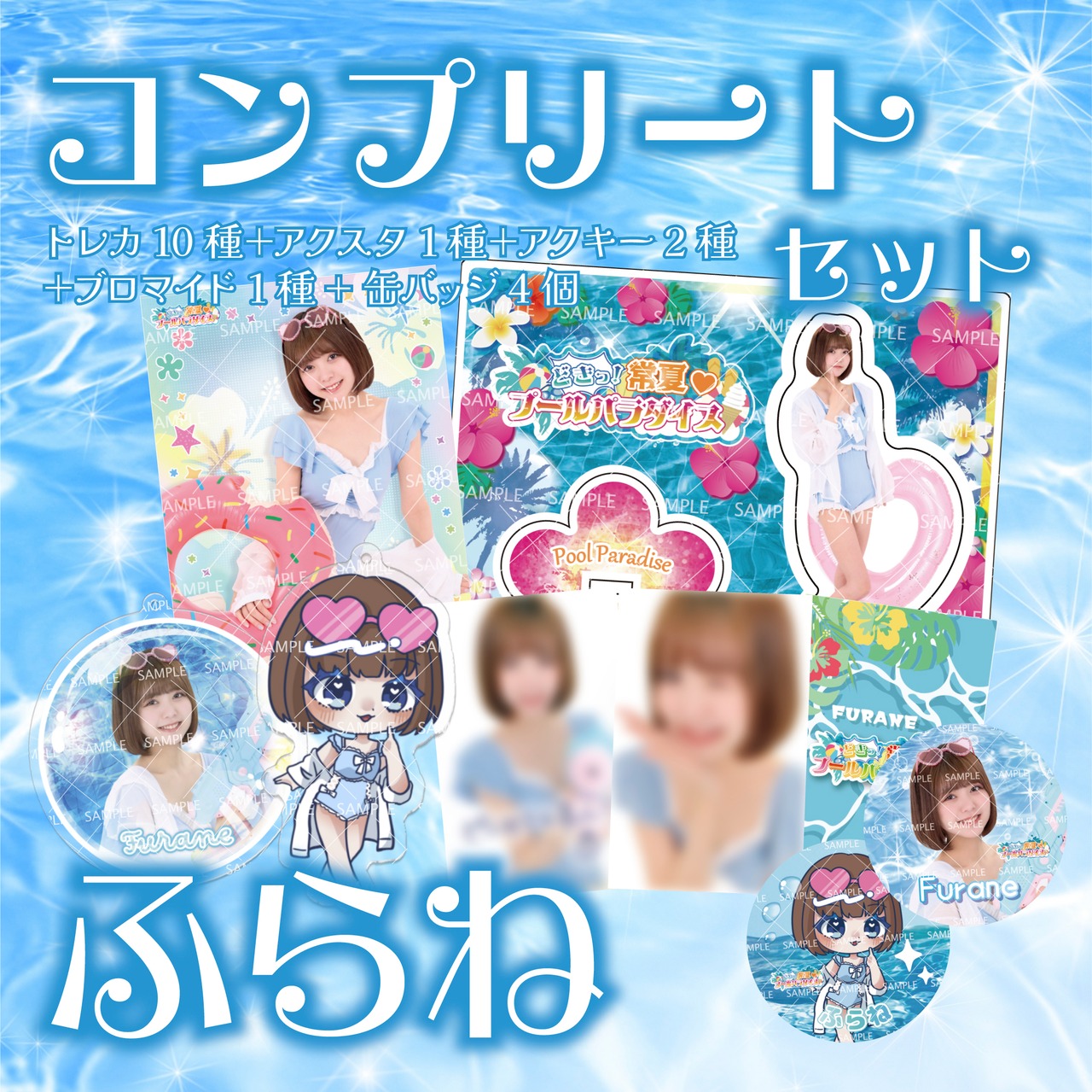 「どきっ!常夏♡プールパラダイス」のブロマイド1種・アクリルスタンド1個・イラストアクリルキーホルダー1個・実写アクリルキーホルダー1個・トレカ全10種・缶バッジ2種のセット商品です。