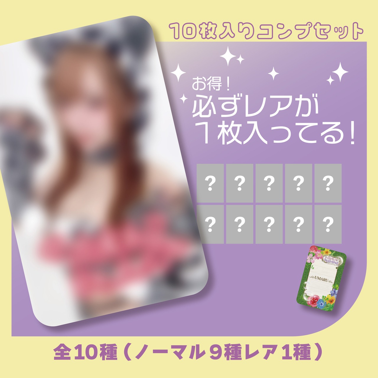 全10種(ノーマル9種・レア1種)全ての絵柄が入っているトレカセットになります。