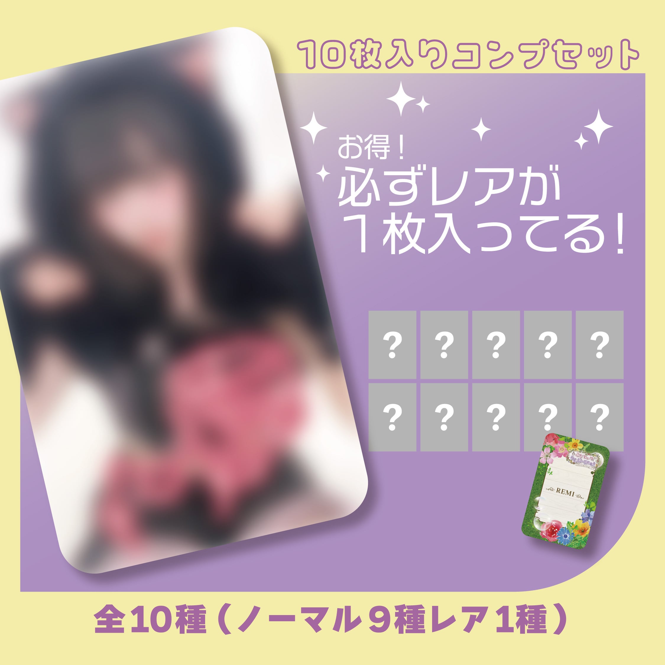 全10種(ノーマル9種・レア1種)全ての絵柄が入っているトレカセットになります。