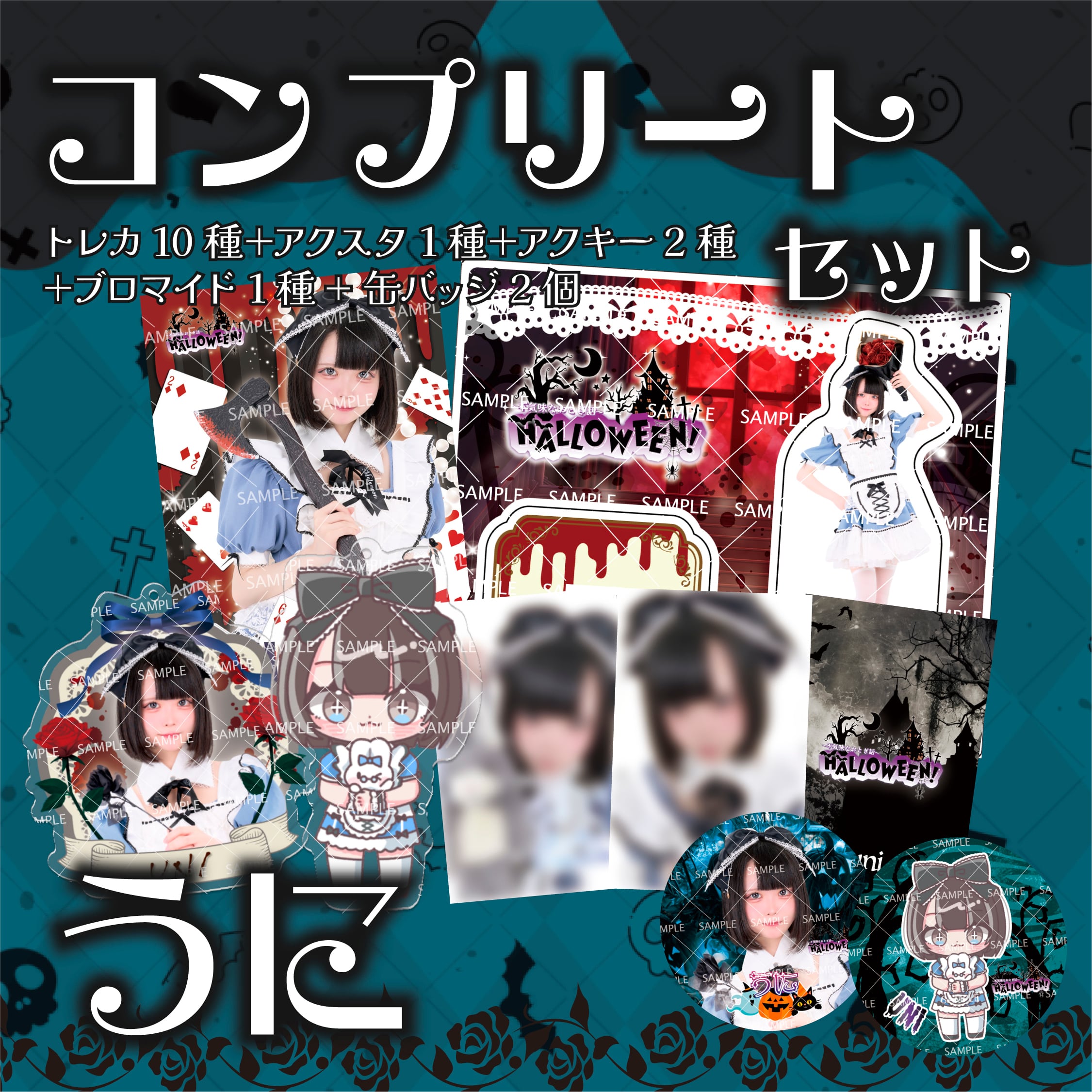 「∼不気味なおとぎ話∼Halloween!」のブロマイド1種・アクリルスタンド1個・イラストアクリルキーホルダー1個・実写アクリルキーホルダー1個・トレカ全10種・缶バッジ2種のセット商品です。