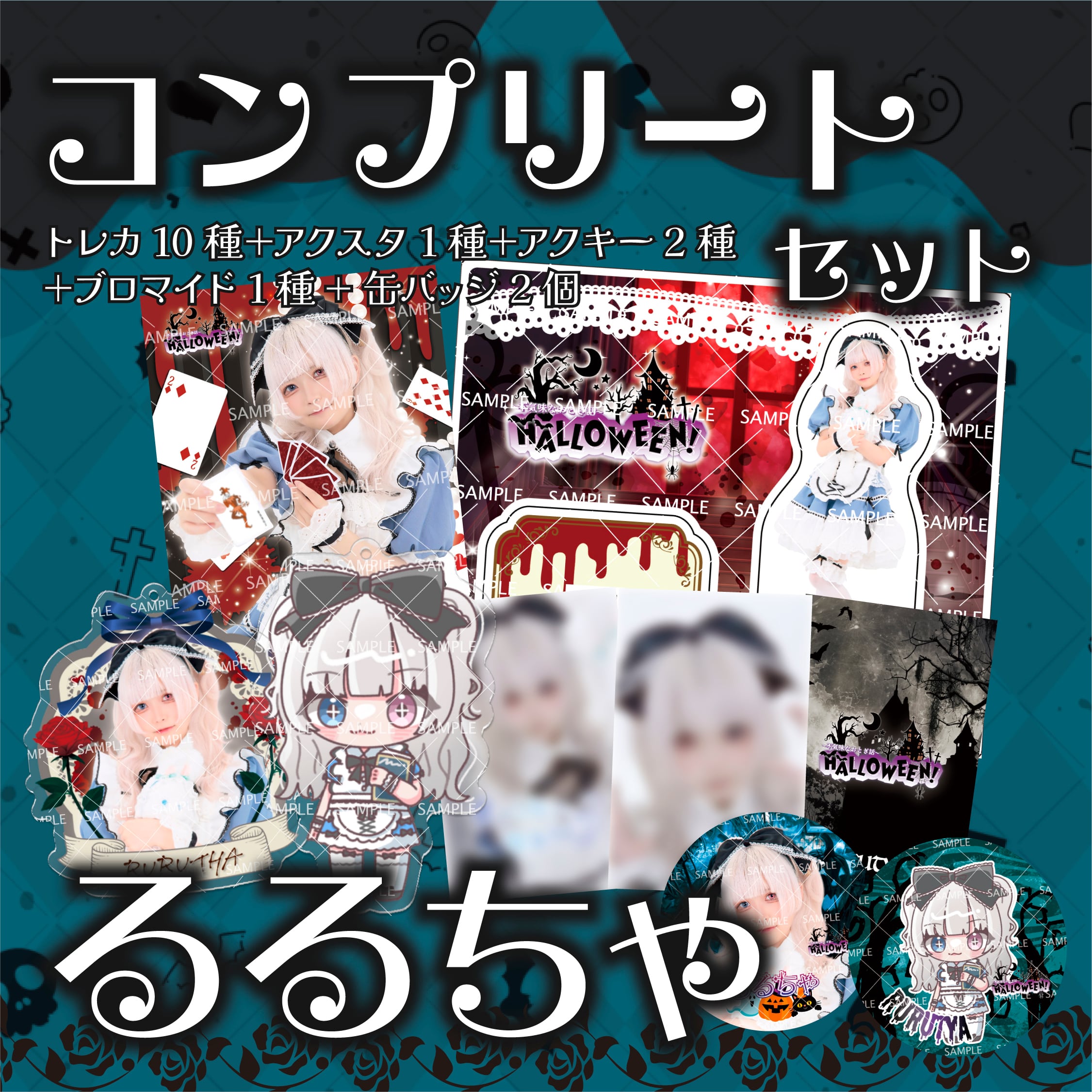 「∼不気味なおとぎ話∼Halloween!」のブロマイド1種・アクリルスタンド1個・イラストアクリルキーホルダー1個・実写アクリルキーホルダー1個・トレカ全10種・缶バッジ2種のセット商品です。
