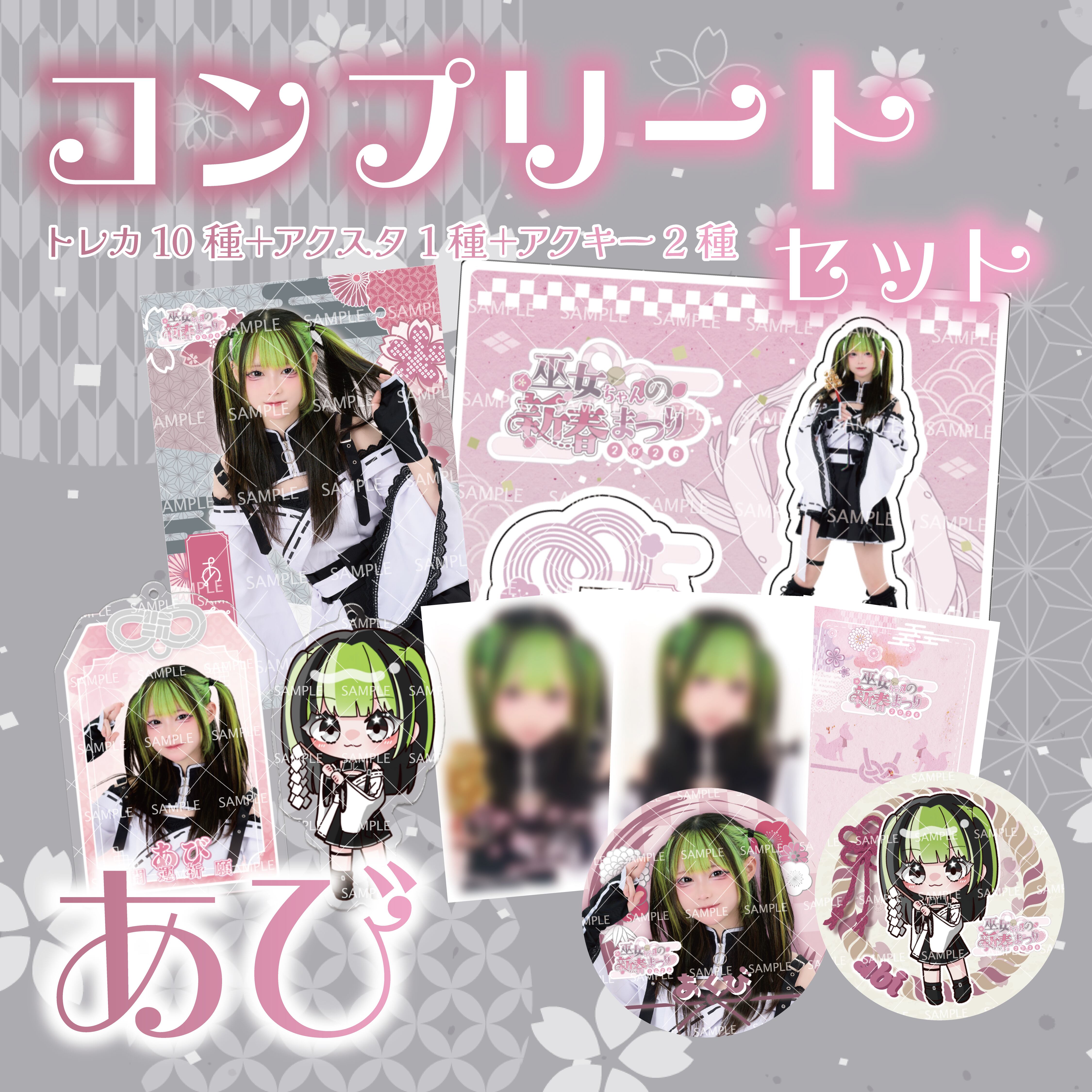 「巫女ちゃんの新春まつり」のブロマイド1種・アクリルスタンド1個・イラストアクリルキーホルダー1個・実写アクリルキーホルダー1個・トレカ全10種・缶バッジ2種のセット商品です。