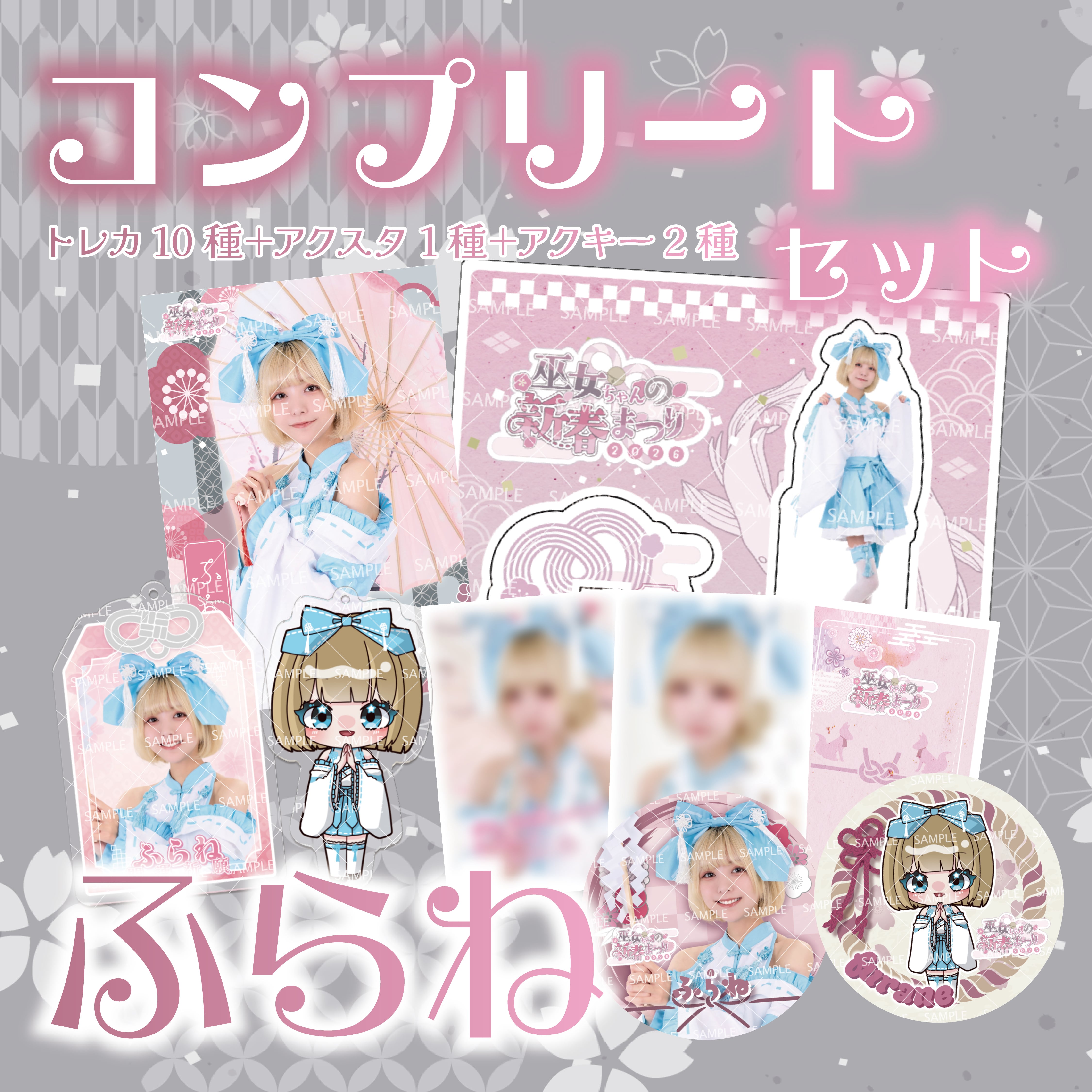 「巫女ちゃんの新春まつり」のブロマイド1種・アクリルスタンド1個・イラストアクリルキーホルダー1個・実写アクリルキーホルダー1個・トレカ全10種・缶バッジ2種のセット商品です。
