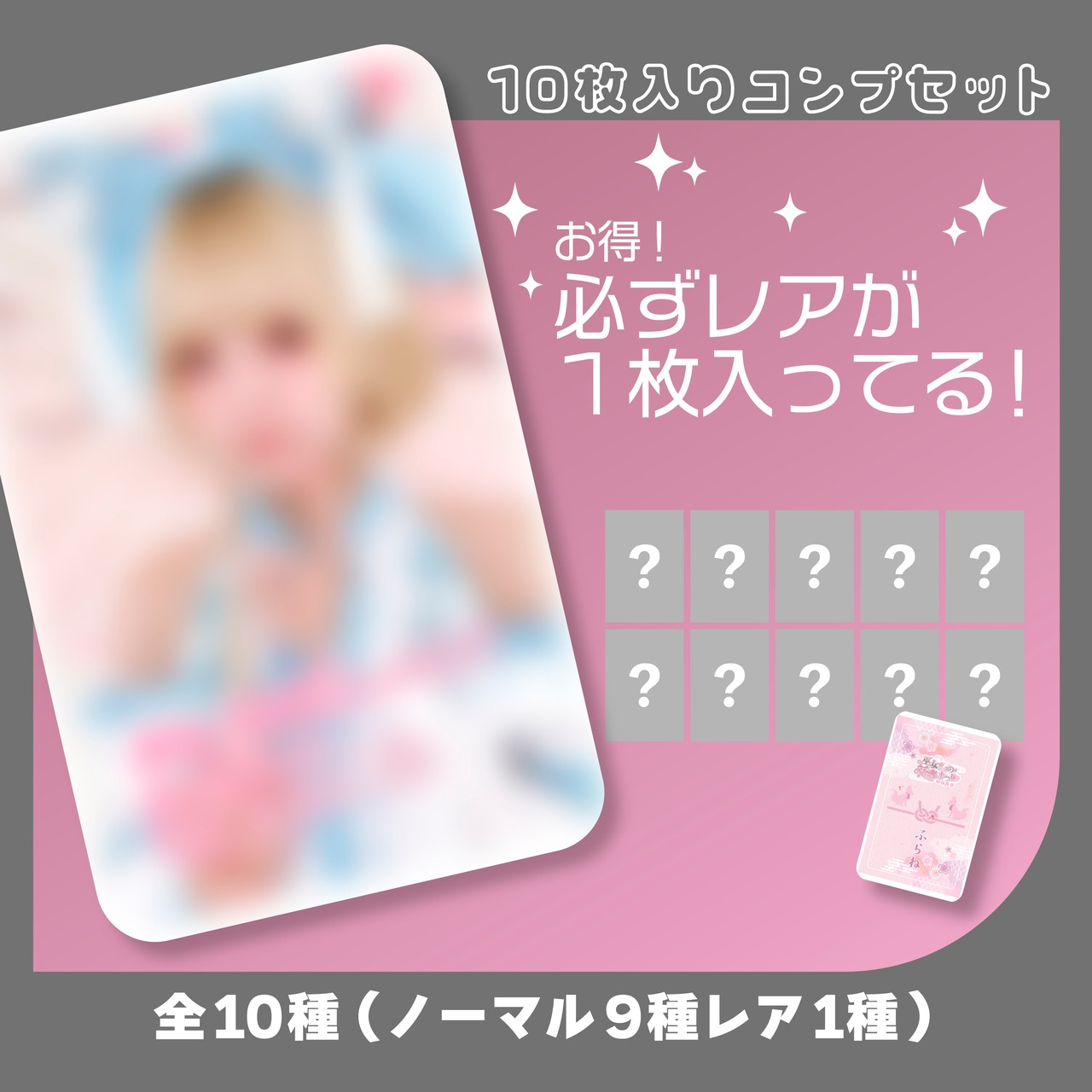 全10種(ノーマル9種・レア1種)全ての絵柄が入っているトレカセットになります。
