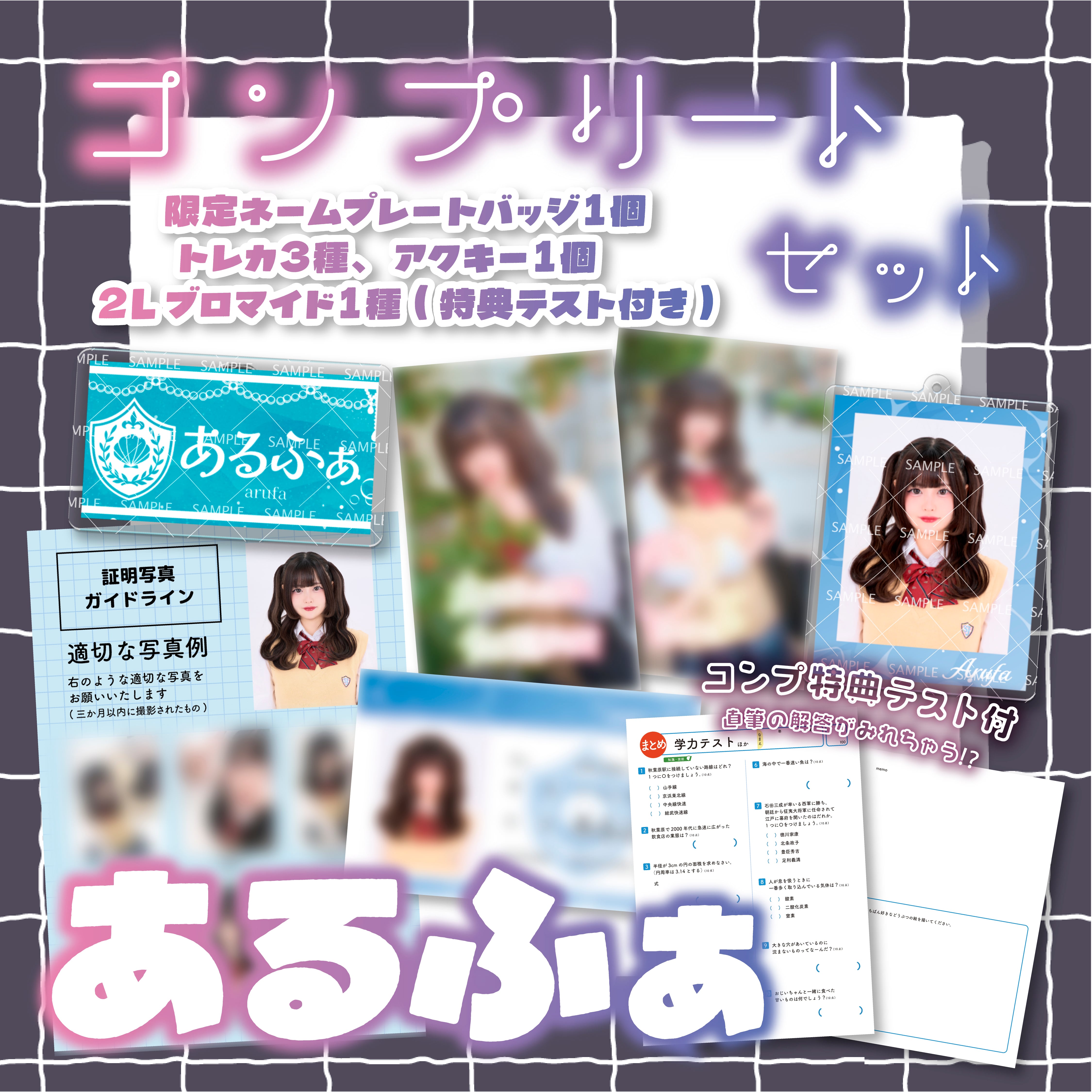 「キミとひみつの寄り道」の数量限定ネームプレートバッジ1個・ブロマイド1種・実写アクリルキーホルダー1個・トレカ全3種のセット商品です。