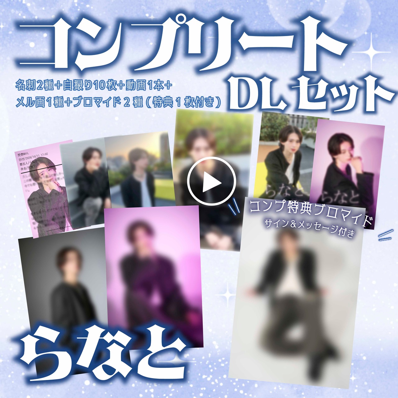 「今夜も君とシャンパンコール」らなとのブロマイド2種・自撮り写真10種・動画1本・名刺2種・メル画1種のコンプリートDLコンテンツです。